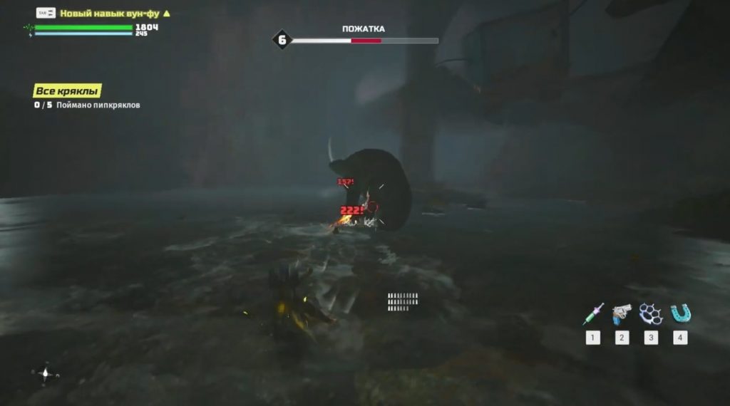 Having solved the puzzle, our hero stops the fan and opens the passage to further passage. We follow the yellow cable, collect things in the chest and rest against the wall. You need to break the wall with weapons to go further. We pass to a large cliff and then the big boss “Harvest” will be waiting for us, which is desirable to shoot from a distance. After the victory, we collect ducks “Pipkryaklov”.