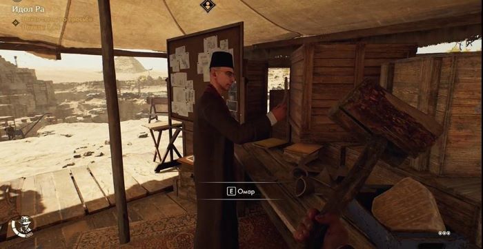 Retorne para Naval; você pode enfrentar vários inimigos pelo caminho. Na tenda de Naval, você precisa colocar todas as estelas que encontrou na bandeja sobre a mesa. Naval pedirá que você cubra a caixa das estelas com outra caixa para escondê-las. Pegue a caixa das estelas e entregue-a ao entregador. A tarefa será concluída e o mensageiro lhe entregará o documento “Permissão de Trabalho”. Naval então nos contará o segredo de Gizé e seus túneis subterrâneos.